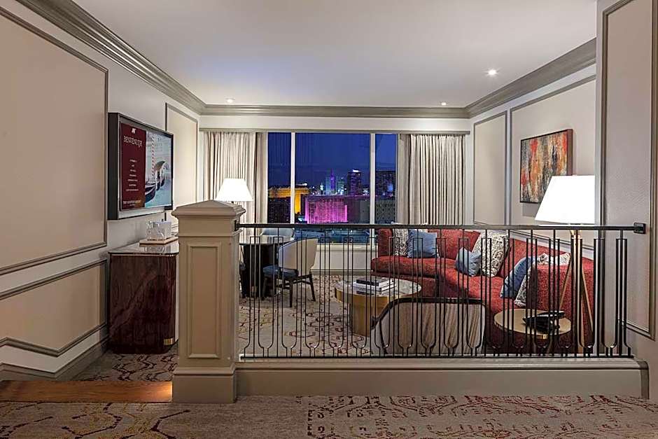 Located on the top three floors of The Venetian North Tower, the 1,300-square-foot Grand One Bedroom Suite provides a lavish respite from the hustle and bustle below with a contemporary, fresh design. Indulge in the finest accommodations featuring a primary bedroom complete with a king bed, 1.5 bathrooms, wet bar, dining area, and a sofa sleeper for extra space.